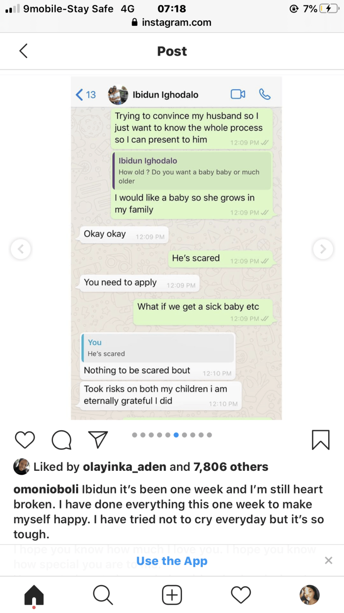 “Ibidun it’s been one week and I’m still heart broken. I have done everything this one week to make myself happy. I have tried not to cry everyday but it’s so tough.