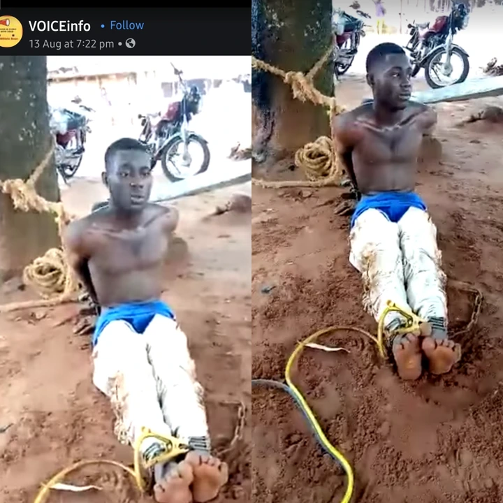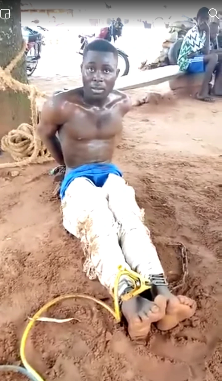 in this video that has make rounds on social media, a man is seen tied up to a tree with chains on his feet as he answers questions by local vigilantes who apprehended him when he was stealing in a near by shop.